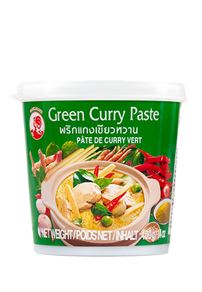 COCK Karry Paste, Grøn Varenummer: 1636 Nettoindhold: 400 g EAN: 084909002365 Antal pr. kolli: 24 Bøtte kollistk Næringsindhold pr. 100g Energi 448kJ / 108kcal Fedt 5,1g – Heraf mættet fedt 2,1g Kulhydrat 11,0g – Heraf sukkerarter 5,3g Protein 1,8g Salt 14,1g Ingredienser Frisk grøn chili(33%), citrongræs, hvidløg, skalotteløg, salt, galangal, spidskommen, korianderfrø. Karrypasta laves af rød chilipeber og er uundværlig i det thailandske køkken. Den giver en stærk og krydret karakter til wok, saucer, gryderetter og supper.