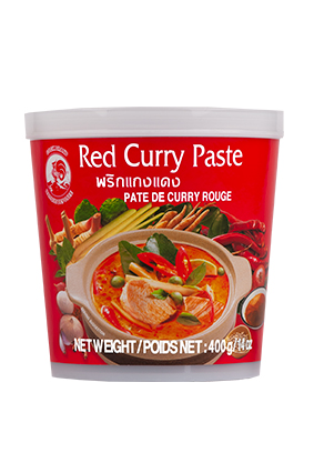 COCK Karry Paste, Rød Varenummer: 1633 Nettoindhold: 400 g EAN: 084909002341 Antal pr. kolli: 24 Bøtte kollistk Næringsindhold pr. 100g Energi 509kJ / 122kcal Fedt 5,5g – Heraf mættet fedt 1,8g Kulhydrat 12,0g – Heraf sukkerarter 7,8g Protein 3,6g Salt 12,8g Ingredienser Tørrede rød chili(28%), citrongræs, skalotteløg, hvidløg, salt, kafir lime skal, galangal, krydderier(spidskommen pulver, korianderfrø). Karrypasta laves af rød chilipeber og er uundværlig i det thailandske køkken. Den giver en stærk og krydret karakter til wok, saucer, gryderetter og supper.