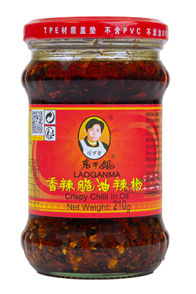 LAOGANMA Crispy Chili i olie Varenummer: 1622 Nettoindhold: 210 g EAN: 6921804720304 Antal pr. kolli: 24 Glas kollistk Næringsindhold pr. 100g Energi 2957kJ / 717kcal Fedt 68,6g – Heraf mættet fedt 6,1g Kulhydrat 10,6g – Heraf sukkerarter 3,7g Protein 7,0g Salt 2,3g Ingredienser SOJAolie 40%, chili 35%, løg, gærede SOJABØNNER(SOJABØNNER, vand), salt, sichuanpeber, sukker, smagsforstærker (E621). .