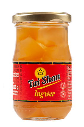 TAI SHAN Syltede Ingefærkugler Varenummer: 3308 Nettoindhold: 240 g EAN: 4008314164018 Antal pr. kolli: 12 Glas kollistk Næringsindhold pr. 100g Energi 1235kJ / 290kcal Fedt 0,3g – Heraf mættet fedt 0,1g Kulhydrat 71,0g – Heraf sukkerarter 70,0g Protein 0,5g Salt 0,0g Ingredienser Ingefær (52%), sukker, vand. I orientalske retter, saucer, kager, konfektkugler, frugtsalat, is m.m. Også god sammen med ost.