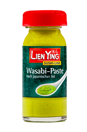 LIEN YING Wasabi Paste Varenummer: 3800 Nettoindhold: 50 g EAN: 4013200885007 Antal pr. kolli: 6 Glas kollistk Næringsindhold pr. 100g Energi 697kJ / 168kcal Fedt 12,0g – Heraf mættet fedt 1,0g Kulhydrat 9,3g – Heraf sukkerarter 6,4g Protein 3,3g Salt 1,2g Ingredienser Peberrod paste (47%) (peberrod(36%), rapsolie, salt, Antioxidant: E223(SULFIT)) vand, rapsolie, lagereddike, salt, mod. stivelse (E1414), wasabi pulver (1%), krydderier, fortyk.middel (E412), surhedsreg.middel: citronsyre, krydderiekstrakt, farve (E133). Benyttes i det japanske køkken. Blandes fx med soya som en traditionel dip til tempura og sushi.