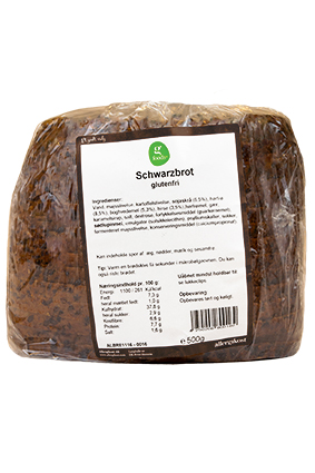 G-FOODS Schwarzbrot, Glutenfri Varenummer: 12007 Nettoindhold: 500 g EAN: 4250208800162 Antal pr. kolli: 6 Pose kollistk Næringsindhold pr. 100g Energi 1100kJ / 261kcal Fedt 7,3g – Heraf mættet fedt 1,0g Kulhydrat 37,8g – Heraf sukkerarter 2,9g Protein 7,7g Salt 1,6g Ingredienser Vand, majsstivelse, kartoffelstivelse, SOJASKRÅ (8,5%), boghvedemel (5,3%), hirse (3,5%), gær, karamelsirup, salt, dextrose, fortykkelsesmiddel (guarkernemel), SØDLUPINMEL, emulgator (solsikkelecithin), sukker, fermenteret majsstivelse, konserveringsmiddel (calciumpropionat). Yderligere allergene info: Kan indeholde spor af: æg, nødder, mælk, sesamfrø Et godt alternativ til rugbrød når du ikke tåler rug. Er desuden vegansk.