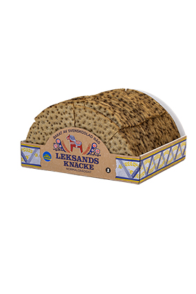 LEKSANDS Knækbrøds Bord Display Varenummer: 9190 Nettoindhold: 1600 g EAN: 17312080005036 Antal pr. kolli: 1 Æske kollistk Næringsindhold pr. 100g Energi 1450kJ / 350kcal Fedt 2,6g – Heraf mættet fedt 0,6g Kulhydrat 64,0g – Heraf sukkerarter 1,3g Protein 9,0g Salt 1,2g Ingredienser FuldkornsRUGmel, vand, gær, salt. LEKSANDS Knækbrød med fuldkorn spises til såvel mellem- som hovedmåltider.