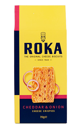 ROKA Kiks med Cheddar & Løg Varenummer: 8228 Nettoindhold: 70 g EAN: 8710588600074 Antal pr. kolli: 12 Æske kollistk Næringsindhold pr. 100g Energi 2350kJ / 560kcal Fedt 40,0g – Heraf mættet fedt 23,0g Kulhydrat 36,0g – Heraf sukkerarter 0,8g Protein 15,0g Salt 2,5g Ingredienser HVEDEmel (GLUTEN), cheddar ost (30%) (MÆLK), vegetabilsk fedt (Palme, kokos) og vegetabilske olier (raps), løg (2%), salt, hvidløg Yderligere allergene info: Kan indeholde spor af sesam. .