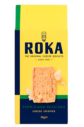 ROKA Kiks med Parmesan Ost Varenummer: 8233 Nettoindhold: 70 g EAN: 8710588600043 Antal pr. kolli: 12 Æske kollistk Næringsindhold pr. 100g Energi 2448kJ / 585kcal Fedt 40,0g – Heraf mættet fedt 22,0g Kulhydrat 44,0g – Heraf sukkerarter 0,9g Protein 14,0g Salt 1,7g Ingredienser HVEDEmel (GLUTEN), vegetabilsk fedt (palme, kokos) og vegetabilske olier (raps), BOB Parmigiano reggiano ost (20%) (MÆLK), salt Yderligere allergene info: Kan indeholde spor af sesam. .