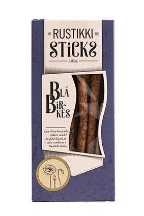 RUSTIKKI Sticks, Blå Birkes Varenummer: 8251 Nettoindhold: 100 g EAN: 5720745355573 Antal pr. kolli: 18 Æske kollistk Næringsindhold pr. 100g Energi 1499kJ / 358kcal Fedt 8,0g – Heraf mættet fedt 0,1g Kulhydrat 64,0g – Heraf sukkerarter 1,1g Protein 11,0g Salt 1,8g Ingredienser HVEDEmel, vand, blå birkes (13,1%), RUGmel, RUGsigte, HAVREflager, gær, RUGsur (eddike, malt-ekstrakt, BYGmalt, RUGmel, mælkesyre), groft salt, groft peber, kommenpulver. Melbehandlingsmiddel : ascorbinsyre: E300. Yderligere allergene info: Kan indeholde spor af: sesam nødder. De sprøde sticks er delikat kryderede og det perfekte tilbehør til middagen, fristende appetitvækkere, lækre i madpakken, på turen, på frokostbordet eller som sprøde appetizers til dine gæster. Nyd dem med ost, dip eller naturel.