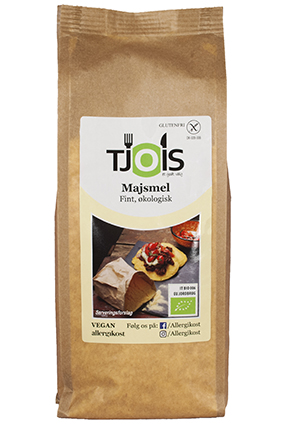 TJOIS Majsmel, Fint, Økologisk Varenummer: 12043 Nettoindhold: 500 g EAN: 5704731001224 Antal pr. kolli: 6 Pose kollistk Næringsindhold pr. 100g Energi 1456kJ / 343kcal Fedt 1,3g – Heraf mættet fedt 0,3g Kulhydrat 75,4g – Heraf sukkerarter 0,8g Protein 6,0g Salt 0,0g Ingredienser Majsmel*. *Fra kontrollerede økologiske landbrug. Fint økologisk majsmel bruges til bagværk, grød, vælling til baby eller pandekager. Pandekagerne kan laves med fyld til et lækkert aftensmåltid.