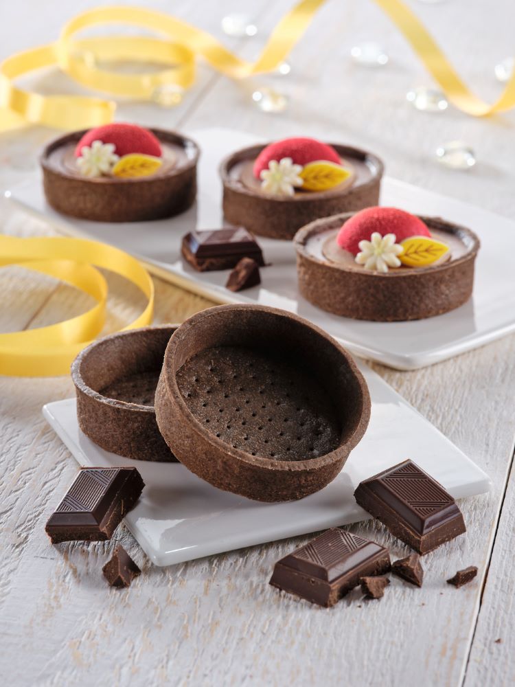 24 stk. HUG Tærteskal Filigrano Smør Choko Rund 5,3cm Varenummer: 9827 Nettoindhold: 240 g EAN: 7610032531996 Antal pr. kolli: 6 Karton kollistk Næringsindhold pr. 100g Energi 2214kJ / 530kcal Fedt 29,0g – Heraf mættet fedt 18,0g Kulhydrat 57,0g – Heraf sukkerarter 16,0g Protein 8,4g Salt 0,1g Ingredienser HVEDEmel, SMØR(22%), sukker, kakaosmør, kakaopulver, trehalose*, isomalt, fedtfattig kakaopulver, kokosolie(Ikke-hydogeneret), VALLEpulver, emulgator: SOJA lechitin, salt, naturlig aroma. *trehalose er en glucosekilde. Velegnet til al slags fyld. Bakke og tærteskal kan lunes i ovnen ved op til 200c.