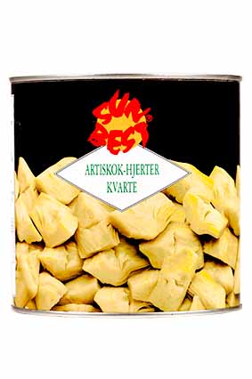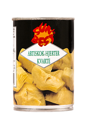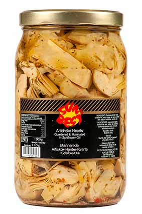 SunBEST Marinerede Artiskok Hjerter, kvarte Varenummer: 9010 Nettoindhold: 1900 g EAN: 5701466489327 Antal pr. kolli: 6 Glas kollistk Næringsindhold pr. 100g Energi 481kJ / 115kcal Fedt 11,0g – Heraf mættet fedt 2,0g Kulhydrat 5,0g – Heraf sukkerarter 0,6g Protein 1,2g Salt 0,6g Ingredienser Artiskokhjerter(kvarte), solsikkeolie, eddike, krydderier, salt, antioxidant: ascorbinsyre, citronsyre. I salater, på pizza, til forretter, sammenkogte retter og som garniture.