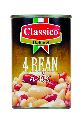 CLASSICO 4 Bønne Mix Varenummer: 3336 Nettoindhold: 400 g EAN: 8029363220117 Antal pr. kolli: 12 Dåse kollistk Næringsindhold pr. 100g Energi 241kJ / 58kcal Fedt 0,7g – Heraf mættet fedt 0,0g Kulhydrat 6,0g – Heraf sukkerarter 0,0g Protein 4,2g Salt 1,0g Ingredienser Cannellini bønner, smør bønner, kik-ærter og røde kidley bønner (variabel kvantum 60%), vand, salt, Antioxidant: Ascorbinsyre (E300) Velegnet som tilbehør til kødretter, salater, supper, Chili con Carne.