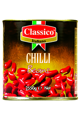 CLASSICO Chili Bønner Varenummer: 9313 Nettoindhold: 2550 g EAN: 8029363215311 Antal pr. kolli: 6 Dåse kollistk Næringsindhold pr. 100g Energi 372kJ / 90kcal Fedt 0,5g – Heraf mættet fedt 0,0g Kulhydrat 13,0g – Heraf sukkerarter 0,0g Protein 6,0g Salt 0,1g Ingredienser Røde Kidney bønner, vand, salt, stivelse, sukker, tomatpuré, chili. Velegnet som tilbehør til forskellige gryderetter, mexicanske retter, eller som dip til tacos