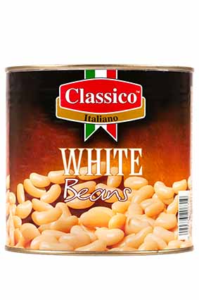 CLASSICO Hvide Cannellini Bønner Varenummer: 9346 Nettoindhold: 2550 g EAN: 8029363206319 Antal pr. kolli: 6 Dåse kollistk Næringsindhold pr. 100g Energi 294kJ / 70kcal Fedt 1,0g – Heraf mættet fedt 0,0g Kulhydrat 10,9g – Heraf sukkerarter 0,0g Protein 4,9g Salt 0,5g Ingredienser Hvide bønner, vand, salt. Til alle former for bønnesalater og grønne salater, i supper og som garniture til fjerkræ og lyst kød. Kan med fordel sauteres på panden i citronolie med salvie.