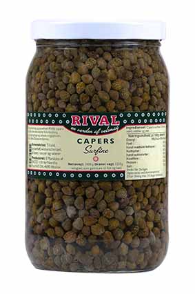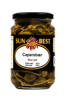 SunBEST Capersbær m/Stilk Varenummer: 1095 Nettoindhold: 350 g EAN: 5701466485893 Antal pr. kolli: 12 Glas kollistk Næringsindhold pr. 100g Energi 123kJ / 29kcal Fedt 0,5g – Heraf mættet fedt 0,0g Kulhydrat 4,0g – Heraf sukkerarter 0,0g Protein 1,7g Salt 7,0g Ingredienser Capersbær m/stilk, eddike, salt. Som snack og garniture. Pynt til fiskeretter, paté, kødretter og osteborde.