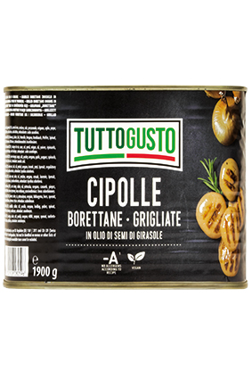 TUTTO GUSTO Grillede Løg i Olie (35-45) Varenummer: 9017 Nettoindhold: 1900 g EAN: 8005528282596 Antal pr. kolli: 6 Dåse kollistk Næringsindhold pr. 100g Energi 229kJ / 72kcal Fedt 5,1g – Heraf mættet fedt 0,6g Kulhydrat 5,9g – Heraf sukkerarter 2,7g Protein 0,7g Salt 1,7g Ingredienser Borettane Løg(63%), solsikkeolie(32%), vineddike, salt, sukker, persille, oregano, spinat, hvidløg, peber, spinat, surhedsregulerende midler: glucenodeltaacton, citronsyre, mælkesyre, antioxidant: askorbinsyre. I salatbaren, som garniture til kød og fjerkræ, til tapas.