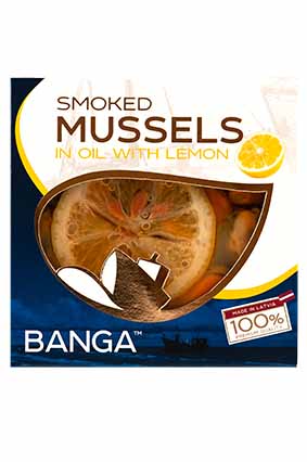 BANGA Røgede Musllinger i olie med Citron Varenummer: 7149 Nettoindhold: 120 g EAN: 4751017402863 Antal pr. kolli: 14 Dåse kollistk Næringsindhold pr. 100g Energi 1067kJ / 258kcal Fedt 24,0g – Heraf mættet fedt 2,0g Kulhydrat 2,5g – Heraf sukkerarter 0,0g Protein 8,0g Salt 1,5g Ingredienser Røget MUSLINGER (Mytilus chilensis, opdræt Chile) 60%, rapsolie 24%, citron 4%, citronaroma, salt. Vi gør alt for at fjerne skalrester, men der kan stadig være nogen tilbage. Fjernes inden spisning. På et stykke ristet franskbrød, på pizza, til paella og risotto, eller til frisk kogt pasta.