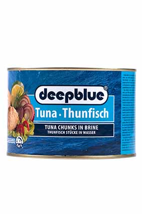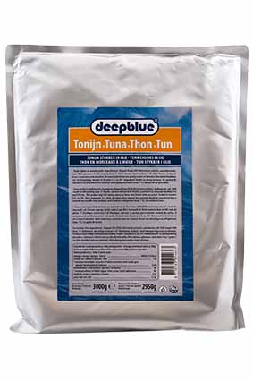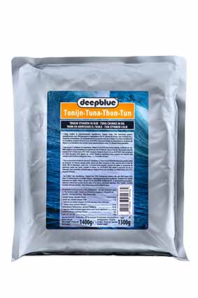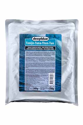 DEEP BLUE Tun i Vand Varenummer: 9725 Nettoindhold: 1400 g EAN: 8710535206908 Antal pr. kolli: 6 Pose kollistk Næringsindhold pr. 100g Energi 420kJ / 99kcal Fedt 0,8g – Heraf mættet fedt 0,4g Kulhydrat 0,0g – Heraf sukkerarter 0,0g Protein 23,0g Salt 0,6g Ingredienser Skipjacktun(FISK)(93%), vand, salt. Ideel til salater og tunmousse.