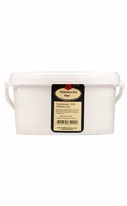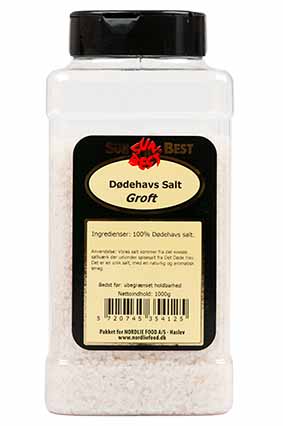 SunBEST Døde Havs Salt Fint Varenummer: 9751 Nettoindhold: 4000 g EAN: 5720745352992 Antal pr. kolli: 1 Spand kollistk Næringsindhold pr. 100g Energi 0kJ / 0kcal Fedt 0,0g – Heraf mættet fedt 0,0g Kulhydrat 0,0g – Heraf sukkerarter 0,0g Protein 0,0g Salt 100,0g Ingredienser 100% Dødehavs salt. Vores salt kommer fra det eneste saltværk der udvinder spisesalt fra Det Døde Hav. Det er en unik salt, med en naturlig og aromatisk smag.