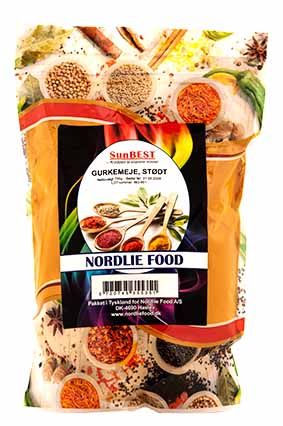 SunBEST Gurkemeje, Stødt Varenummer: 9777 Nettoindhold: 750 g EAN: 5720745355351 Antal pr. kolli: 6 Pose kollistk Næringsindhold pr. 100g Energi 1487kJ / 354kcal Fedt 10,0g – Heraf mættet fedt 3,1g Kulhydrat 65,0g – Heraf sukkerarter 3,2g Protein 8,0g Salt 0,1g Ingredienser Gurkemeje. Som krydderi i madlavning.