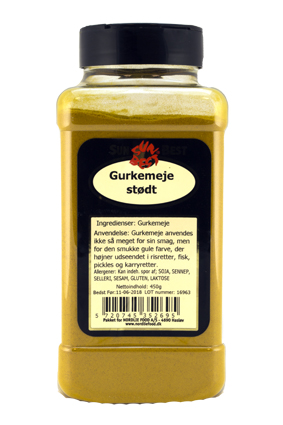 SunBEST Gurkemeje, stødt Varenummer: 7834 Nettoindhold: 450 g EAN: 5720745352695 Antal pr. kolli: 6 Bøtte kollistk Næringsindhold pr. 100g Energi 1451kJ / 351kcal Fedt 9,9g – Heraf mættet fedt 3,0g Kulhydrat 44,0g – Heraf sukkerarter 3,2g Protein 9,9g Salt 0,0g Ingredienser Gurkemeje. Yderligere allergene info: Kan indeh. spor af; SOJA, SENNEP, SELLERI, SESAM, GLUTEN, LAKTOSE Gurkemeje anvendes ikke så meget for sin smag, men for den smukke gule farve, der højner udseendet i risretter, fisk, pickles og karryretter.