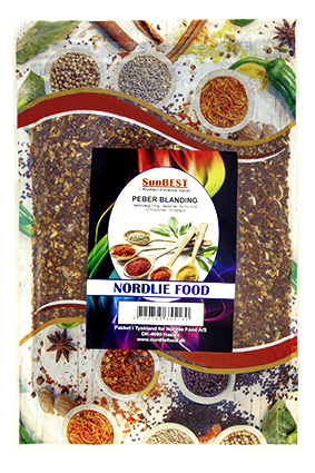 SunBEST Peber blanding Varenummer: 9775 Nettoindhold: 201 g EAN: 5720745355160 Antal pr. kolli: 6 Pose kollistk Næringsindhold pr. 100g Energi 1296kJ / 310kcal Fedt 3,3g – Heraf mættet fedt 2,1g Kulhydrat 52,0g – Heraf sukkerarter 49,4g Protein 10,9g Salt 3,0g Ingredienser Sort peber, paprika, chili, havsalt, koriander, tørret løg, gul SENNEP, SELLERI. Til al slags madlavning.