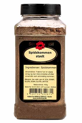 SunBEST Spidskommen, stødt Varenummer: 7833 Nettoindhold: 450 g EAN: 5720745352671 Antal pr. kolli: 6 Bøtte kollistk Næringsindhold pr. 100g Energi 1879kJ / 455kcal Fedt 22,3g – Heraf mættet fedt 0,0g Kulhydrat 44,2g – Heraf sukkerarter 0,0g Protein 17,8g Salt 0,0g Ingredienser Spidskommen. Yderligere allergene info: Kan indeh. spor af; SOJA, SENNEP, SELLERI, SESAM, GLUTEN, LAKTOSE Frøene har en skarp smag og kan ikke erstattes af eller anvendes som almindelig kommen.