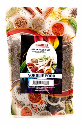SunBEST Steak Peber-Mix Varenummer: 9747 Nettoindhold: 750 g EAN: 5720745354941 Antal pr. kolli: 6 Pose kollistk Næringsindhold pr. 100g Energi 1296kJ / 310kcal Fedt 3,3g – Heraf mættet fedt 0,9g Kulhydrat 52,0g – Heraf sukkerarter 49,4g Protein 10,9g Salt 3,0g Ingredienser Peber knust, salt. Til al slags madlavning.