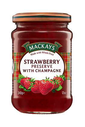 MACKAYS Jordbær Marmelade m/Champagne Varenummer: 3731 Nettoindhold: 340 g EAN: 637793001015 Antal pr. kolli: 6 Glas kollistk Næringsindhold pr. 100g Energi 1147kJ / 270kcal Fedt 0,0g – Heraf mættet fedt 0,0g Kulhydrat 66,9g – Heraf sukkerarter 66,6g Protein 0,3g Salt 0,0g Ingredienser Sukker, jordbær (35%), champagne(0,7%), geleringsmiddel: pektin, marc de champagne (0,3%), surhedsregulerende middel: citronsyre. Fremstillet af 35g frugt pr. 100g. Samlet sukkermængde: 65g pr. 100g. Benyttes oftest som pålæg på brød. Kan også bruges som sødemiddel eller fyld i kager, eller som pynt på yoghurt.