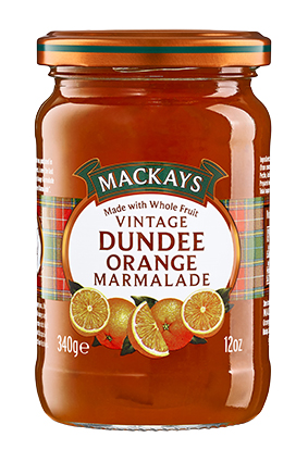 MACKAYS Vintage Dundee Orange Marmelade Varenummer: 3730 Nettoindhold: 340 g EAN: 637793000919 Antal pr. kolli: 6 Glas kollistk Næringsindhold pr. 100g Energi 1107kJ / 260kcal Fedt 0,0g – Heraf mættet fedt 0,0g Kulhydrat 64,0g – Heraf sukkerarter 64,0g Protein 0,0g Salt 0,0g Ingredienser Sukker, seville appelsiner (25%), brun farin, citronjuice(af koncentrat), geleringsmiddel: pektin, surhedsregulerende middel: citronsyre, orangeolie. Fremstillet af 25g frugt pr. 100g. Samlet sukkermængde: 65g pr. 100g. Benyttes oftest som pålæg på brød. Kan også bruges som sødemiddel eller fyld i kager, eller som pynt på yoghurt.
