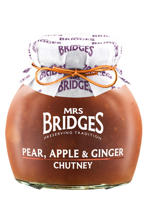 Mrs. Bridges Daddel & Figen Chutney Varenummer: 3774 Nettoindhold: 295 g EAN: 637793011618 Antal pr. kolli: 6 Glas kollistk Næringsindhold pr. 100g Energi 708kJ / 167kcal Fedt 0,4g – Heraf mættet fedt 0,0g Kulhydrat 39,3g – Heraf sukkerarter 28,6g Protein 1,4g Salt 0,8g Ingredienser Æbler, dadler (20%), cider-eddike, figner (10%), sukker, løg, sultanas, ingefær, chilli, salt, hvidløg. Til ostebordet.