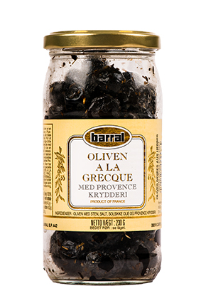 BARRAL Middelhavs Oliven Mix Varenummer: 9177 Nettoindhold: 4000 g EAN: 3101150034451 Antal pr. kolli: 1 Spand kollistk Næringsindhold pr. 100g Energi 699kJ / 167kcal Fedt 17,1g – Heraf mættet fedt 0,4g Kulhydrat 2,2g – Heraf sukkerarter 0,0g Protein 1,2g Salt 5,0g Ingredienser Oliven (grønne, natur sorte og lilla) 58%, vand (29,8%), rød peber (5%), salt (5%), solsikkeolie (2%), krydderi (0,05%). Surhedsregmiddel: Citronsyre (E330).Konserveringsmiddel: E202. I salater, til tapas, i sydlandsk inspirerede retter, på pizza og som snack.