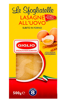 GIGLIO Lasagne m/æg ovn-klar Varenummer: 6696 Nettoindhold: 500 g EAN: 8012169001219 Antal pr. kolli: 12 Æske kollistk Næringsindhold pr. 100g Energi 1579kJ / 373kcal Fedt 3,5g – Heraf mættet fedt 1,0g Kulhydrat 69,5g – Heraf sukkerarter 3,2g Protein 14,0g Salt 0,0g Ingredienser Durum HVEDEmel, ÆG (19,4%). Til lasagne.