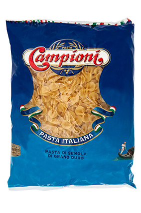 CAMPIONI FIOCCHI, Sløjfer Varenummer: 6680 Nettoindhold: 1000 g EAN: 8005900140803 Antal pr. kolli: 12 Pose kollistk Næringsindhold pr. 100g Energi 1505kJ / 355kcal Fedt 1,5g – Heraf mættet fedt 0,3g Kulhydrat 72,0g – Heraf sukkerarter 3,2g Protein 12,0g Salt 0,0g Ingredienser Hvide pasta: Durum HVEDE semola, vand. Yderligere allergene info: Kan indeholde spor af: ÆG, SOJA Til alle pasta retter, i salat. Varen er forkogt.