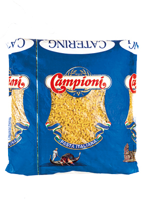CAMPIONI CHIFFIRINI, Suppehorn Varenummer: 9628 Nettoindhold: 3000 g EAN: 8005900160238 Antal pr. kolli: 4 Pose kollistk Næringsindhold pr. 100g Energi 1506kJ / 360kcal Fedt 0,8g – Heraf mættet fedt 0,1g Kulhydrat 75,0g – Heraf sukkerarter 0,0g Protein 11,6g Salt 0,1g Ingredienser Durum HVEDE semola, vand. Til alle pasta retter, i salat. Varen er forkogt.