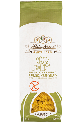 PASTA NATURA Pasta med Bambusfibre, Glutenfri Varenummer: 12067 Nettoindhold: 250 g EAN: 8050534140590 Antal pr. kolli: 10 Pose kollistk Næringsindhold pr. 100g Energi 1380kJ / 326kcal Fedt 1,6g – Heraf mættet fedt 0,6g Kulhydrat 68,0g – Heraf sukkerarter 0,6g Protein 7,9g Salt 0,0g Ingredienser Majsmel, rismel, 8% bambusfibre. Yderligere allergene info: Kan indeholde spor af: soja Skruer med bambusfibre. Er rigtig lækre som kold pastasalat.