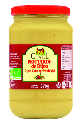 CHATEL Fransk Dijon Sennep, Økologisk Varenummer: 3364 Nettoindhold: 370 g EAN: 3335121135223 Antal pr. kolli: 12 Glas kollistk Næringsindhold pr. 100g Energi 529kJ / 127kcal Fedt 9,0g – Heraf mættet fedt 0,6g Kulhydrat 2,8g – Heraf sukkerarter 2,0g Protein 6,0g Salt 2,8g Ingredienser Vand, SENNEPsfrø*, eddike*, salt. *) fra kontrollerede økologisk landbrug. Som tilbehør til charcuterivarer og diverse varme retter. Specielt velegnet til saucer og dressing.