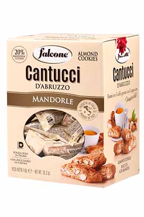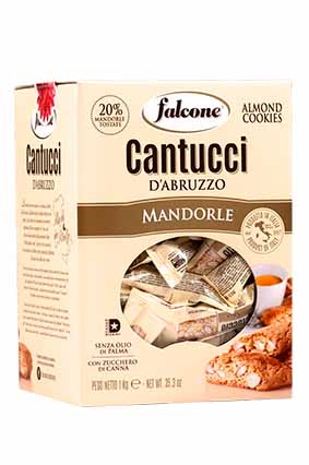 FALCONE Cantuccini 18% mandler Varenummer: 9494 Nettoindhold: 1000 g EAN: 8023696002235 Antal pr. kolli: 6 Æske kollistk Næringsindhold pr. 100g Energi 1932kJ / 459kcal Fedt 15,3g – Heraf mættet fedt 6,4g Kulhydrat 67,5g – Heraf sukkerarter 21,1g Protein 12,3g Salt 0,2g Ingredienser HVEDEmel, sukker, MANDLER 18%, (ÆG)æggehvider, rørsukker, bagepulver (natriumfosfat, natriumkarbonat), smør(MÆLK), honning, aromaer, salt. Nyd dem til en god kop kaffe. Eller gør som italienerne dyp den i Vino Santo. Ca. 125 stk i enkelt styks pakninger.