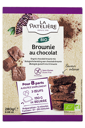 LA PATELIERE Browniemix, Øko Glutenfri Varenummer: 12046 Nettoindhold: 280 g EAN: 3278584360163 Antal pr. kolli: 7 Pakke kollistk Næringsindhold pr. 100g Energi 1649kJ / 390kcal Fedt 4,1g – Heraf mættet fedt 1,6g Kulhydrat 80,0g – Heraf sukkerarter 60,0g Protein 5,4g Salt 0,1g Ingredienser Chokoladepulver* 46% (kakao: 39% minimum) (rørsukker*, kakaopulver*), rørsukker*, rismel*, salt. *fra kontrolleret økologiske jordbrug. Yderligere allergene info: Kan indeholde spor af æg og hvede Mix til chokolade Brownie