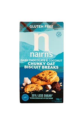 NAIRN’S Havre & Kokos Kiks Vegetarisk Glutenfri Varenummer: 12037 Nettoindhold: 160 g EAN: 612322000783 Antal pr. kolli: 6 Pakke kollistk Næringsindhold pr. 100g Energi 2000kJ / 478kcal Fedt 22,9g – Heraf mættet fedt 11,1g Kulhydrat 55,8g – Heraf sukkerarter 18,8g Protein 8,5g Salt 0,7g Ingredienser FuldkornsHAVRE (glutenfri) (57%), palmeolie, R.S.P.O, mørke chokoladestykker (10%), (sukker, kakaomasse, kakaosmør, emulgator: SOJAlechithin, naturlig vanillearoma), brun sukker, tørret kokosnød (5%), tapiokastivelse, delvis inverteret sirup, hævemiddel: (sodium, bikarbonat, ammoniumkarbonat), naturlig aroma, havsalt. Både fabrik og opskrift er nøddefri. Vi kan dog ikke garantere, at råvarerne er nøddefrie. Yderligere allergene info: Kan indeholde spor af: mælk & nødder Kiks med havre og kokos. Dejlig til kaffebordet eller som snack når du er lidt sulten.