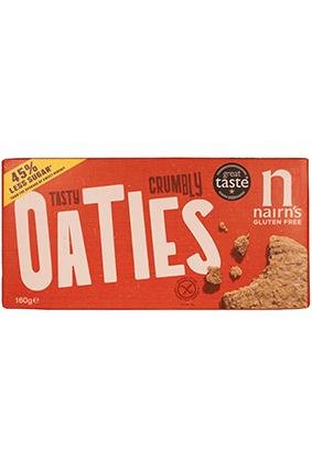 NAIRN’S Oaties, Glutenfri Varenummer: 12034 Nettoindhold: 160 g EAN: 612322001131 Antal pr. kolli: 8 Pakke kollistk Næringsindhold pr. 100g Energi 2017kJ / 482kcal Fedt 22,4g – Heraf mættet fedt 9,2g Kulhydrat 57,5g – Heraf sukkerarter 15,2g Protein 9,2g Salt 1,0g Ingredienser Glutefri fuldkornsHAVRE (69%), palmeolie (RSPO), sukker, delvis inverteret sirup, Lyles Goldensirup, tapioka stivelse, hævemiddel (natrium bikarbonat) havsalt. Både fabrik og opskrift er nøddefrie. Vi kan dog ikke garantere, at råvarerne er nøddefrie. Yderligere allergene info: Kan indeholde spor af: mælk og nødder Oaties til den lille sult.