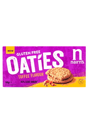 NAIRN’S Oaties Toffeesmag, Vegetarisk Glutenfri Varenummer: 12157 Nettoindhold: 160 g EAN: 612322030346 Antal pr. kolli: 8 Pakke kollistk Næringsindhold pr. 100g Energi 2032kJ / 203kcal Fedt 22,4g – Heraf mættet fedt 9,4g Kulhydrat 60,6g – Heraf sukkerarter 15,0g Protein 7,2g Salt 1,2g Ingredienser Glutenfri fuldkornsHAVRE (67%), palmeolie (RSPO), sukker, delvis inverteret sirup, Lyles Goldensirup, tapioka stivelse, hævemiddel (natrium bikarbonat) havsalt. Både fabrik og opskrift er nøddefrie. Vi kan dog ikke garantere, at råvarerne er nøddefrie. Ikke egnet hvis du reagerer på avanin – et protein i havre Oaties til den lille sult.