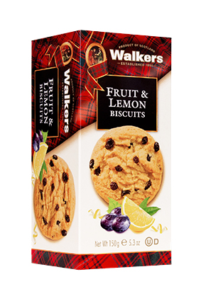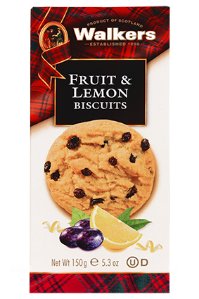 WALKERS Småkage m/Frugt & Citron Varenummer: 8917 Nettoindhold: 150 g EAN: 039047005136 Antal pr. kolli: 12 Æske kollistk Næringsindhold pr. 100g Energi 2121kJ / 507kcal Fedt 25,6g – Heraf mættet fedt 7,7g Kulhydrat 63,3g – Heraf sukkerarter 33,0g Protein 4,6g Salt 0,6g Ingredienser Hvedemel (HVEDEMEL, E170, jern, niacin, thiamin), vegetabilsk olie(raps, palme), sukker, ribs(12%), kandiserede citronskaller(4%) (Citronskaller, glukose fruktose sirup, sukker, koncentreret citron juice), SKUMMETMÆLKSPULVER, hævemidler: Soda, disodium pyrophosphate; citronolie. Yderligere allergene info: Kan indeholde spor af: nødder Småkage fremstillet efter traditionel Skotsk opskrift.