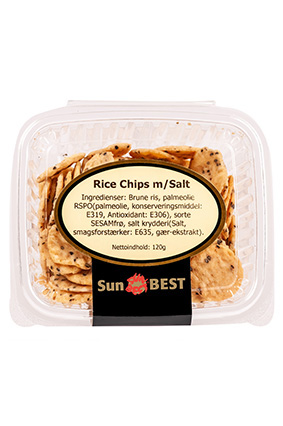 SunBEST Rice Chips med Sesam & Peber Varenummer: 9465 Nettoindhold: 500 g EAN: 5720745355986 Antal pr. kolli: 6 Pose kollistk Næringsindhold pr. 100g Energi 1770kJ / 423kcal Fedt 8,3g – Heraf mættet fedt 0,9g Kulhydrat 76,3g – Heraf sukkerarter 2,3g Protein 8,2g Salt 1,6g Ingredienser Ris(83,4%), solsikkeolie, sukker, sort SESAMFRØ(1,43%) , maltodextrin, salt, hvidløgspulver, knust sort peber(0,94%), SØDMÆLKSPULVER, havsalt, løgpulver, gærekstrakt, antioxidant: E306, smagsforstærker(E627),(E631). Yderligere allergene info: Kan indeholde spor af: gluten, jordnødder, soja, nødder. SunBEST ris chips er knasende sprøde chips krydret med peber.