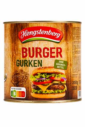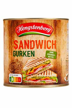 HENGSTENBERG Syltede Sandwich Agurker Varenummer: 9123 Nettoindhold: 2450 g EAN: 4008100140332 Antal pr. kolli: 3 Dåse kollistk Næringsindhold pr. 100g Energi 99kJ / 23kcal Fedt 0,5g – Heraf mættet fedt 0,1g Kulhydrat 3,9g – Heraf sukkerarter 3,8g Protein 0,8g Salt 1,5g Ingredienser Agurker, brændevinseddike, sukker, salt, urteekstrakt, krydderiekstrakt, farvestof: riboflavin. På smørrebrød eller i sandwich.