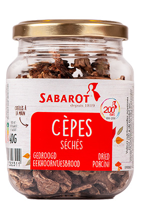SABAROT Karl Johan Svampe Varenummer: 4611 Nettoindhold: 40 g EAN: 3111950032311 Antal pr. kolli: 6 Bøtte kollistk Næringsindhold pr. 100g Energi 1599kJ / 378kcal Fedt 6,0g – Heraf mættet fedt 0,0g Kulhydrat 51,0g – Heraf sukkerarter 0,0g Protein 30,0g Salt 0,0g Ingredienser Tørrede Karl Johan svampe. Tilberedning: Svampene lægges i blød i lunkent vand min. 2 timer og skylles grundigt. Behandles herefter som friske svampe.
