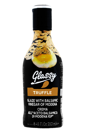 GLASSY Balsamico Glaze Trøffel Varenummer: 40126 Nettoindhold: 250 ml EAN: 8036622240625 Antal pr. kolli: 6 Flaske kollistk Næringsindhold pr. 100g Energi 768kJ / 183kcal Fedt 0,0g – Heraf mættet fedt 0,0g Kulhydrat 42,0g – Heraf sukkerarter 32,3g Protein 1,4g Salt 0,1g Ingredienser Indkogt druemost, balsamisk vineddike fra Modena ((39%) vineddike, indkogt druemost, farvestof E150d)), sukker, farve E150d (karamel), modificeret majs stivelse, aroma (0,15%). Indeholder SULFIT. Flot til at dekorere med på tallerkenen. Giver maden det ekstra pift. God til carpaccio,pasta, barbecue, pasta og æg.