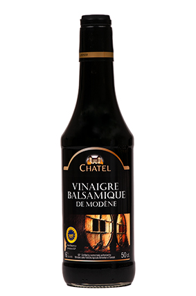 CHATEL 4-årig Balsamisk Eddike Varenummer: 3360 Nettoindhold: 500 ml EAN: 3335122723504 Antal pr. kolli: 6 Flaske kollistk Næringsindhold pr. 100g Energi 293kJ / 70kcal Fedt 0,0g – Heraf mættet fedt 0,0g Kulhydrat 12,0g – Heraf sukkerarter 11,5g Protein 0,1g Salt 0,0g Ingredienser Vineddike og indkogt druemost, Farvestof: Karamel E150d. Konserveringsmiddel: E224 (SULFIT). Ideel til olie/eddike dressinger, som smagsforstærker i saucer, eller kogt ind til glace. Også perfekt til marinering.