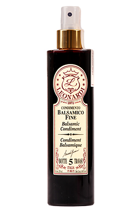 LEONARDI Rød Balsamico Spray Varenummer: 3391 Nettoindhold: 250 ml EAN: 8033378345185 Antal pr. kolli: 6 Flaske kollistk Næringsindhold pr. 100g Energi 655kJ / 154kcal Fedt 0,0g – Heraf mættet fedt 0,0g Kulhydrat 34,0g – Heraf sukkerarter 34,0g Protein 1,0g Salt 0,0g Ingredienser Indkogt druemost. Indeholder SULFITTER Nem og hygiejnisk at dosere, når salaten, osten eller desserten skal have et friskt pift.